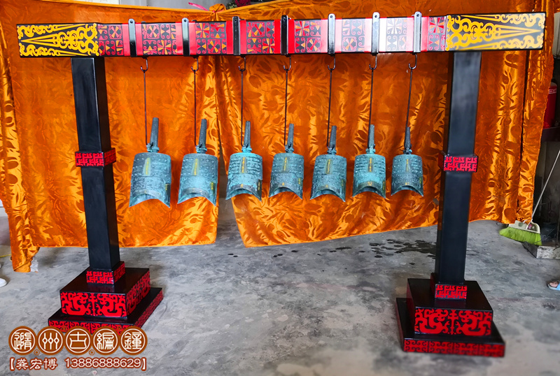 隨州古編鐘公司按客戶要求制作7件仿古編鐘,長2.35米×寬0.45米×高1.5米。編鐘外形按照聞名世界的隨州曾侯乙編鐘仿制,編鐘為青銅鑄造;采用標(biāo)準(zhǔn)音音高A=440Hz調(diào)音1——7,要求聲音清脆悅耳,有延續(xù)音,無啞音編鐘,編鐘大梁采用優(yōu)質(zhì)板材制作,表面按設(shè)計(jì)噴漆,彩繪花紋,配套演奏木錘1把,包裝木箱。